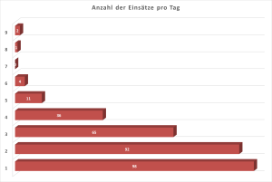 Die Auswertung der Anzahl der Einsätze pro Tag verdeutlicht, dass der Großteil der Einsätze an Tagen mit ein bis drei Alarmierungen stattfand. Besonders häufig waren Tage mit ein oder zwei Einsätzen, während Tage mit mehr als fünf Einsätzen deutlich seltener vorkamen. Jedoch zeigen einzelne Spitzentage mit bis zu neun Einsätzen, dass es auch zu außergewöhnlichen Belastungssituationen kommen kann.
