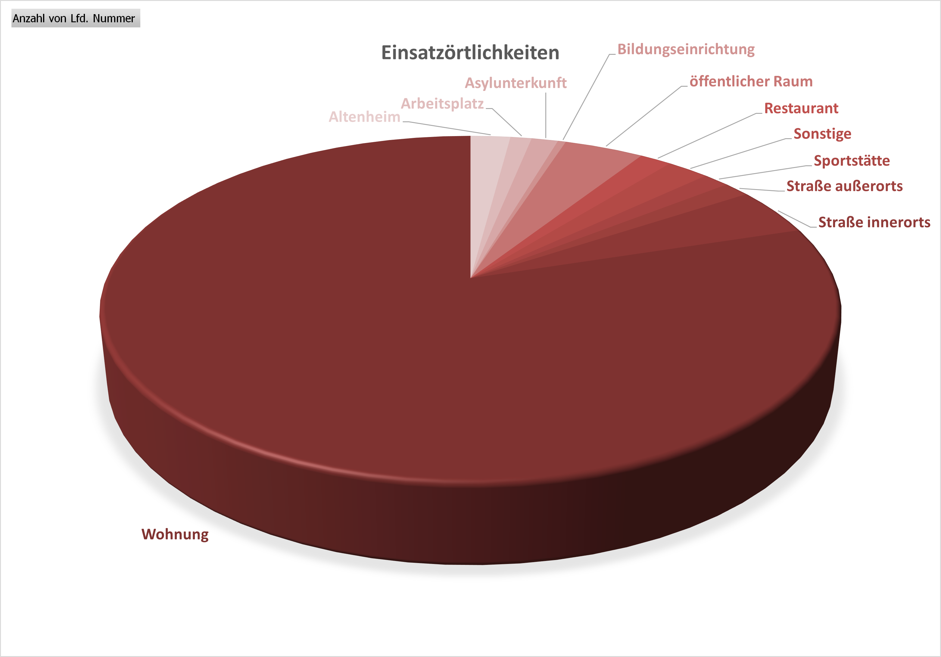 Ein Blick auf die Einsatzörtlichkeiten macht deutlich, dass der überwiegende Teil der Einsätze im häuslichen Umfeld stattfand. Wohnungen stellen mit Abstand den häufigsten Einsatzort dar. Weitere Einsatzorte waren unter anderem Straßen innerorts und außerorts, öffentliche Räume, Sportstätten, Restaurants, Bildungseinrichtungen sowie Arbeitsplätze und Pflegeeinrichtungen. Dies unterstreicht die große Bandbreite der Einsatzszenarien.