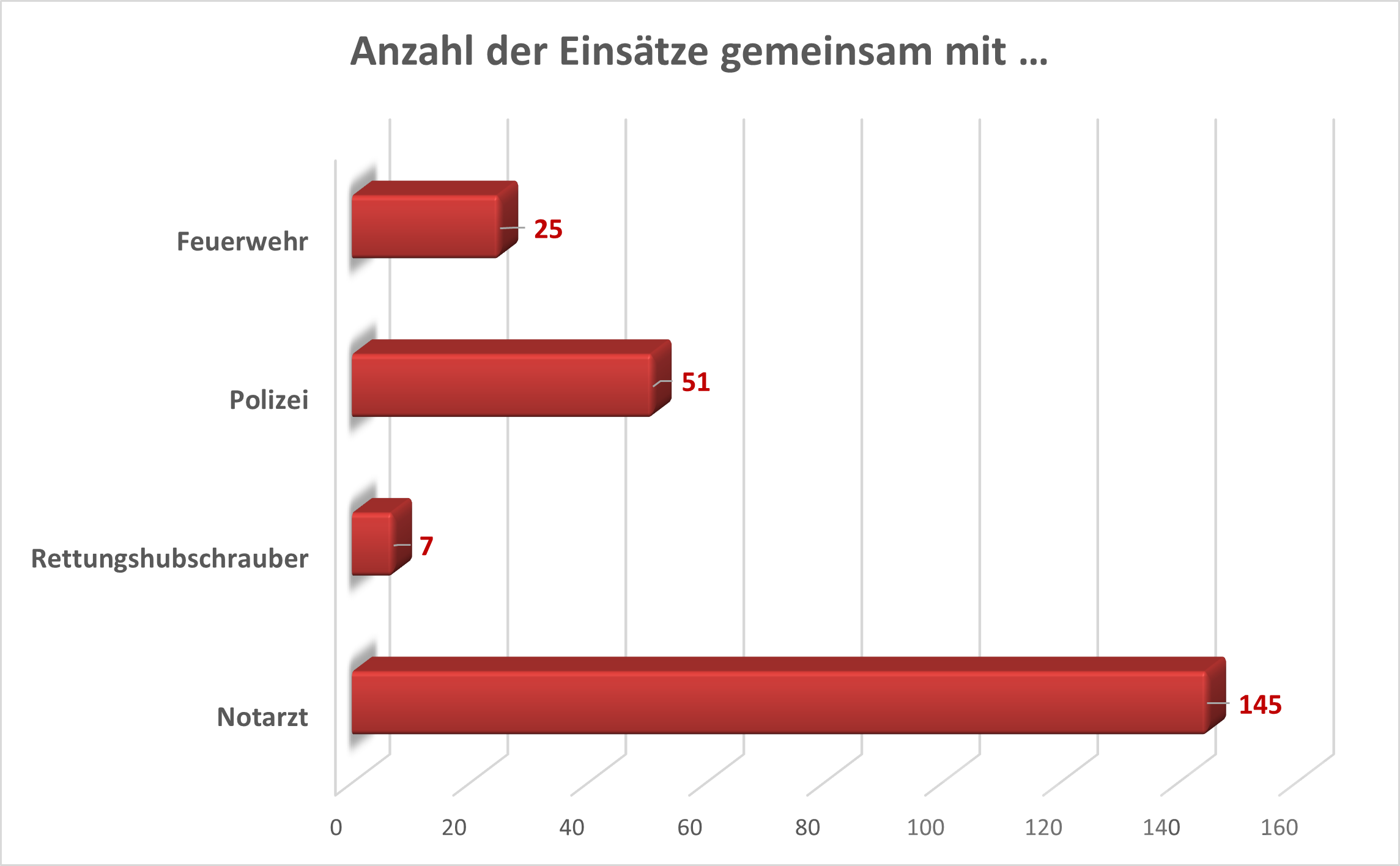 Die Statistik zu den Einsätzen gemeinsam mit anderen Organisationen zeigt eine enge Zusammenarbeit mit dem professionellen Rettungsdienst, denn zu jedem Einsatz wird von der Integrierten Leitstelle (ILS) mindestens ein Rettungswagen disponiert. Darüber hinaus wurde zu 145 Einsätzen ein Notarzt hinzugesandt, davon in 7 Fällen ein Rettungshubschrauber. Auch mit der Polizei und der Feuerwehr kam es regelmäßig zu gemeinsamen Einsätzen. Diese Zahlen verdeutlichen die routinierte und professionelle Zusammenarbeit sowie die gute Einbindung der Notfallhilfe in die Rettungskette.