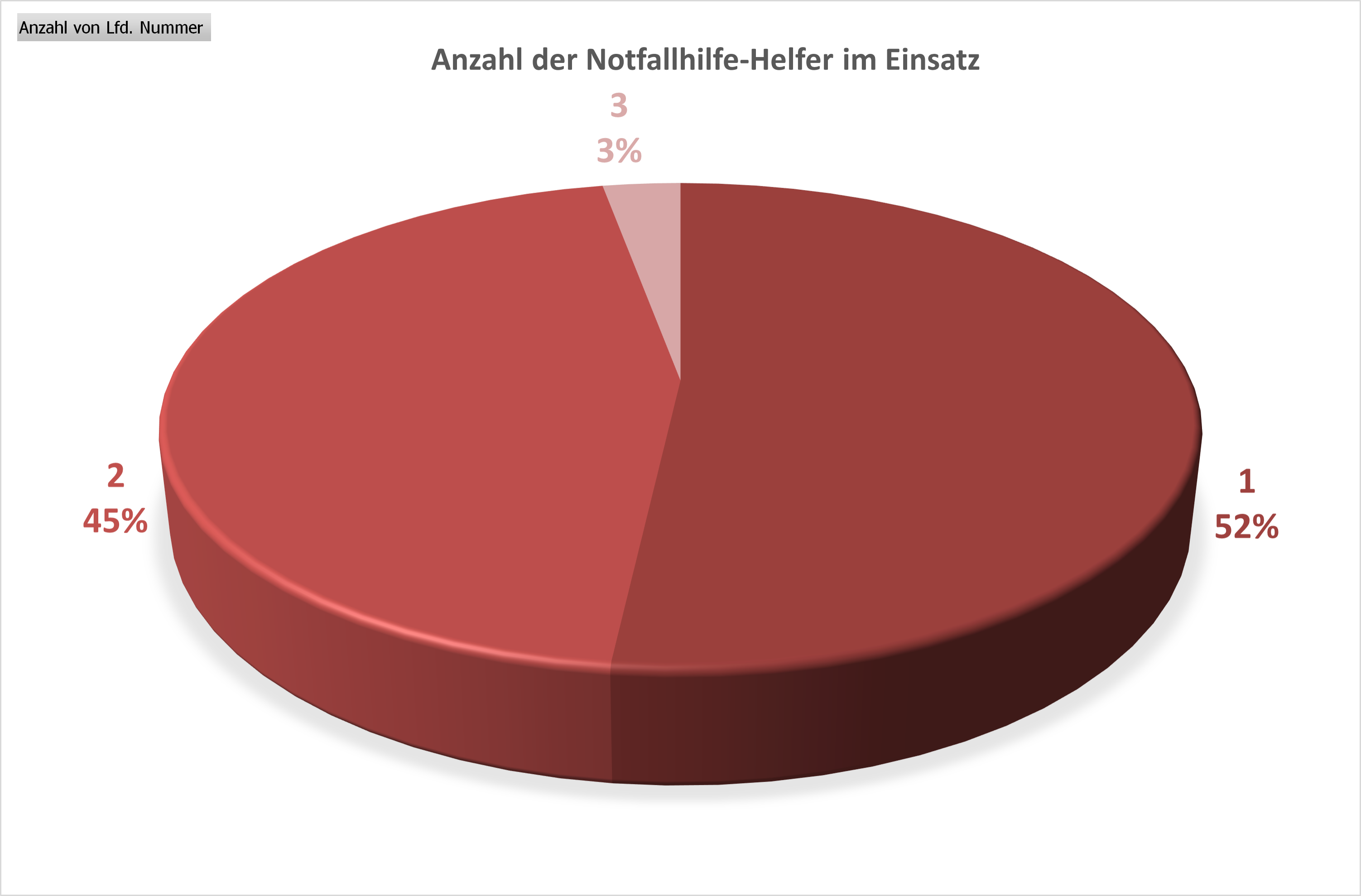 Bei der Betrachtung der Anzahl der Notfallhilfe-Helfer im Einsatz zeigt sich, dass etwas mehr als die Häfte (52 %) der Einsätze mit einem und knapp die Hälfte (45 %) der Einsatze mit zwei Helfern bewältigt wurden. Einsätze mit drei Helfern (z. B. zum Einlernen neuer Helfer oder bei als schwerwiegend gemeldeten Einsatzbildern) stellten die Ausnahme dar.