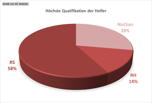 Die Auswertung der höchsten Qualifikation der eingesetzten Helfer zeigt, dass bei einem Großteil der Einsätze mindestens ein Rettungssanitäter (RS) vor Ort war. Ergänzt wurde dies durch Notfallsanitäter (NotSan) sowie Rettungshelfer (RH). Die Statistik unterstreicht das hohe Ausbildungsniveau der eingesetzten Kräfte und die medizinische Kompetenz innerhalb der Notfallhilfe.