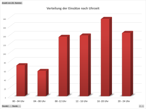 Die tageszeitliche Verteilung der Einsätze zeigt hingegen, dass die meisten Einsätze in den Nachmittags- und Abendstunden gefahren wurden. Besonders der Zeitraum zwischen 16 und 20 Uhr war einsatzintensiv, gefolgt von den Abendstunden bis Mitternacht. Es ist jedoch auch zu erkennen, dass eine erhebliche Anzahl an Einsätzen zwischen 00 Uhr und 08 Uhr (129 Einsätze) gefahren wurden, was für die ehrenamtlich arbeitenden Notfallhelfer eine nicht unerhebliche Belastung neben ihrem regulären beruflichen Alltag darstellt.